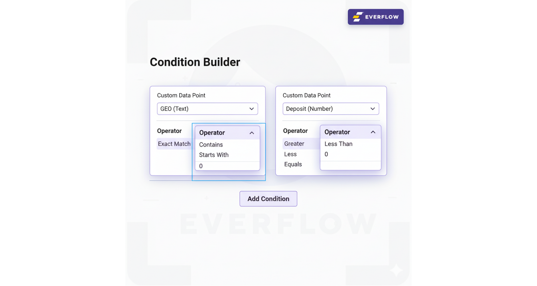 - Smarter Conditions: The "Conditions" builder is now "smarter." Choosing a Text or Number Data Point instantly filters the available operators (e.g., Exact Match for Text vs. Greater Than for Number).