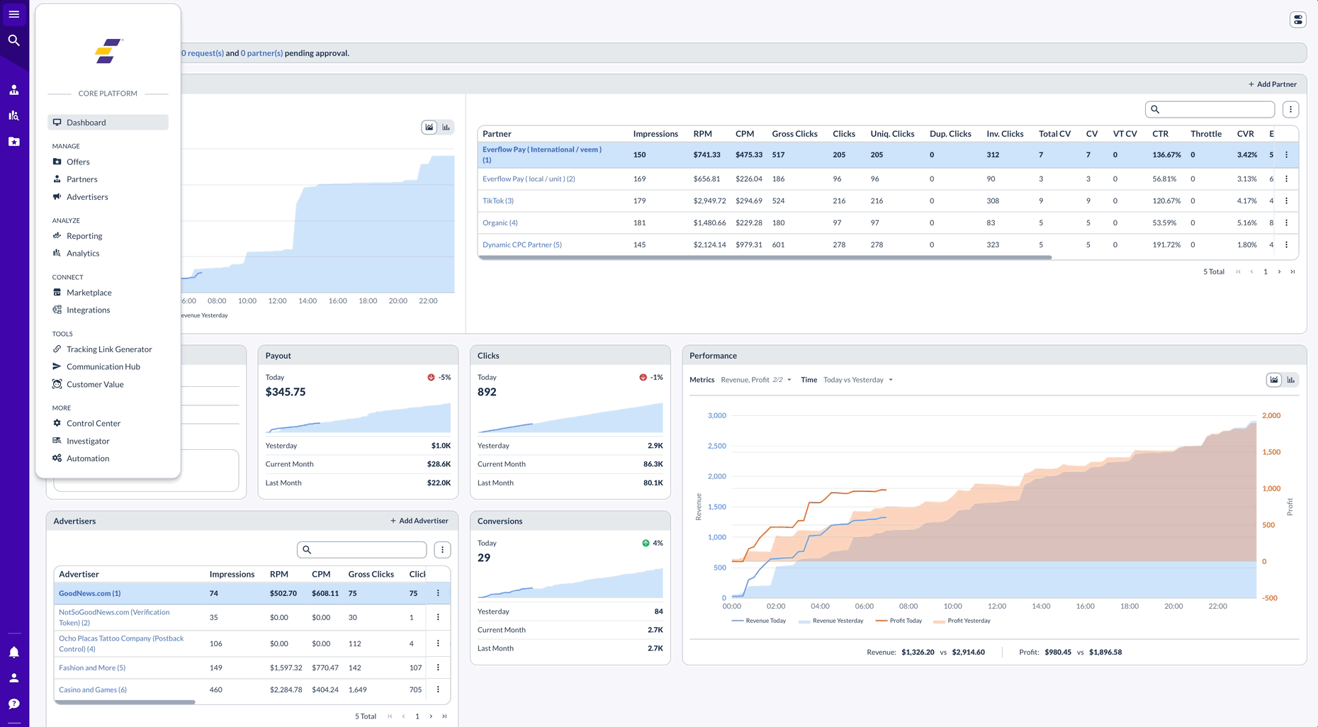 The Everflow Shopify integration automatically connects your Shopify store to track affiliate marketing performance. It monitors when customers click on affiliate links and make purchases, giving you complete visibility into which partners are driving sales.